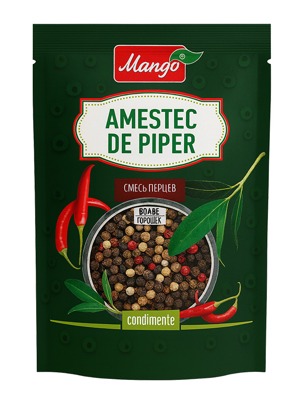 Amestec de piper boabe 50 g – un amestec aromat și echilibrat de piper negru, alb, roșu și verde, care adaugă preparatelor tale o savoare intensă și un aspect rafinat.